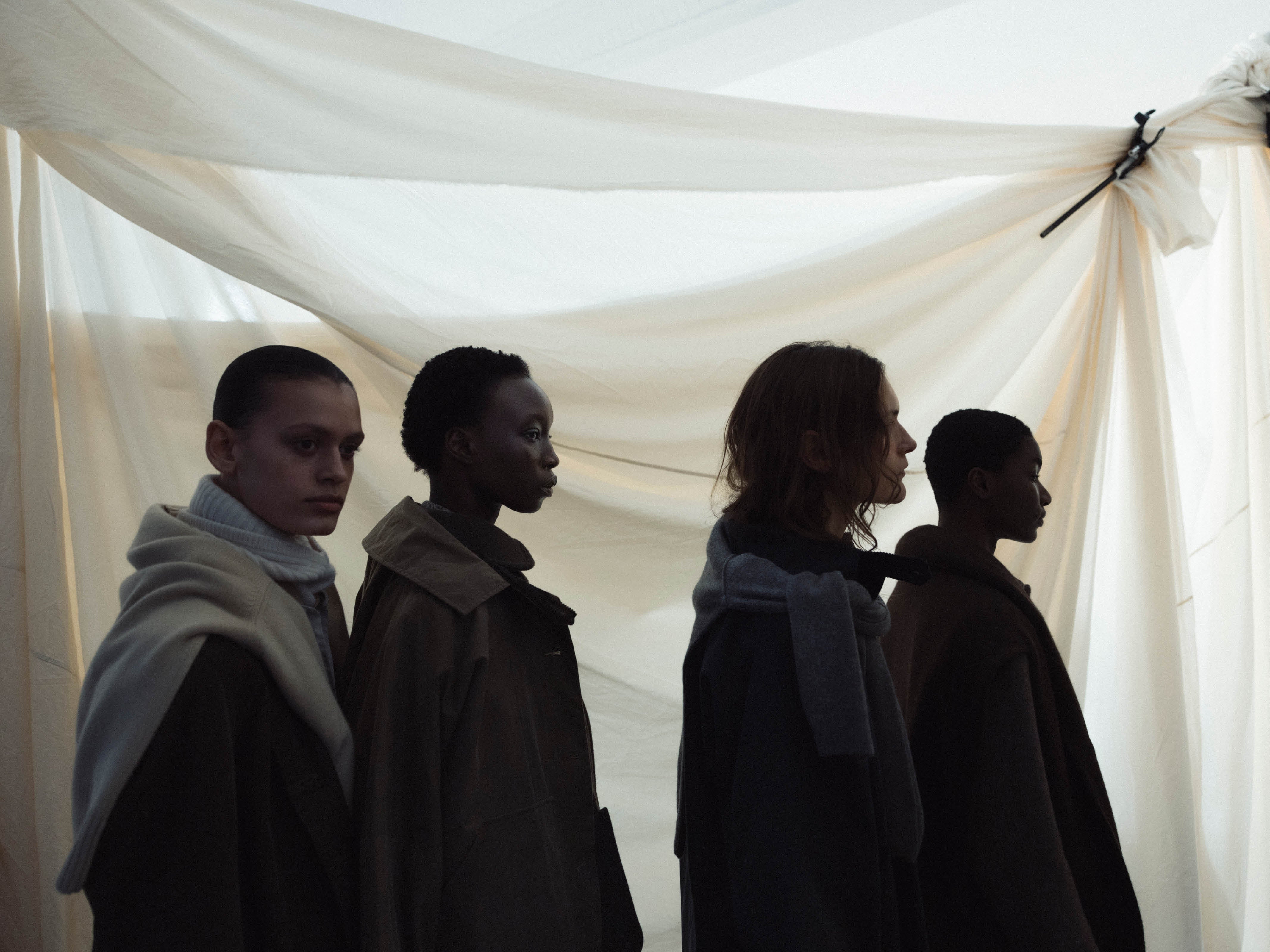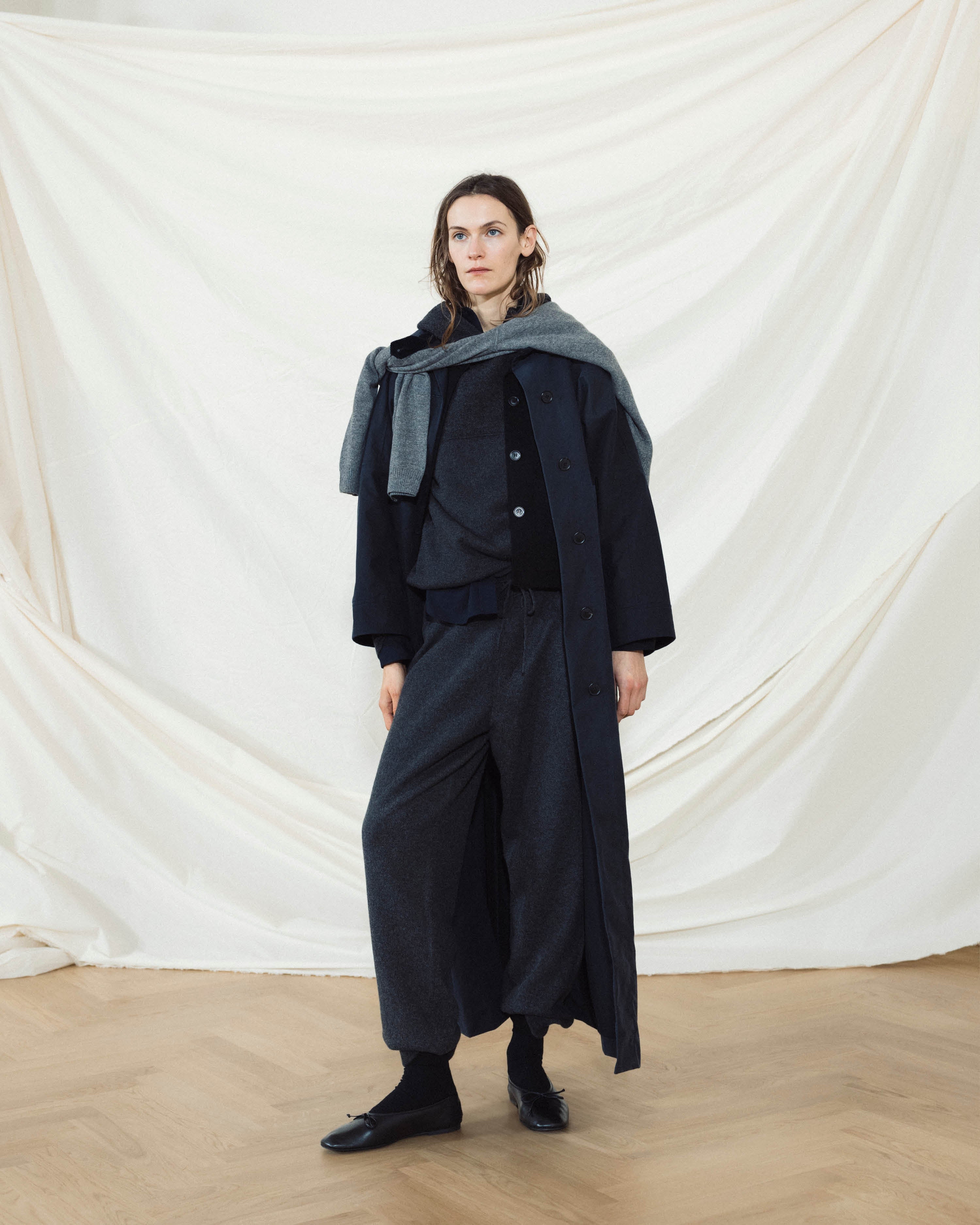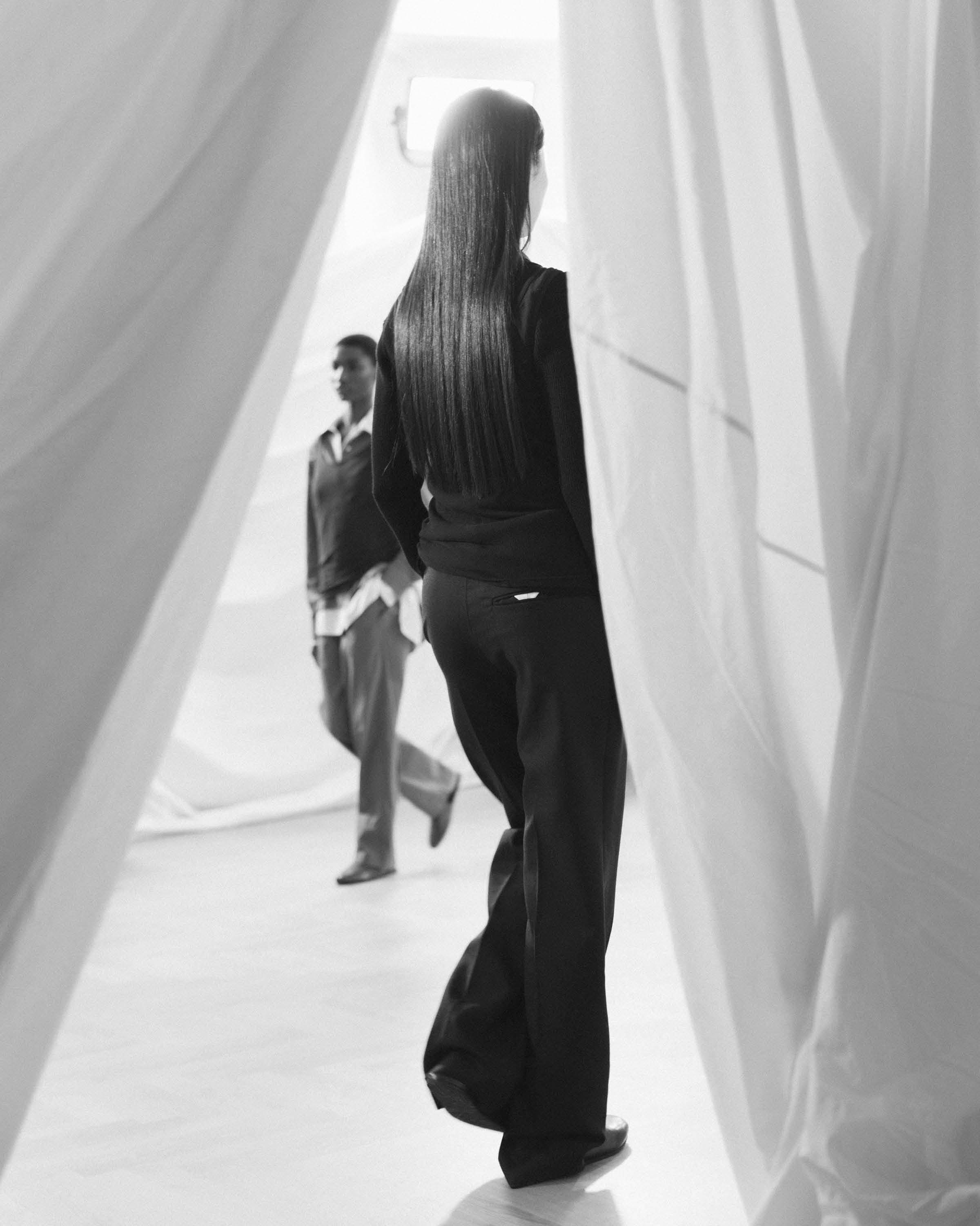 The heart of the presentation, "The Soft Wall"—a cloud-like installation of layered aiayu fabrics emphasizing craftsmanship and natural materials—took center stage. While an ambiance of modern melodies by Danish cellist CTM, Cæcilie Trier, filled the historic room. With deliberate grace, models glided through, showcasing the layered, versatile designs of our Autumn Winter 2025 collection.