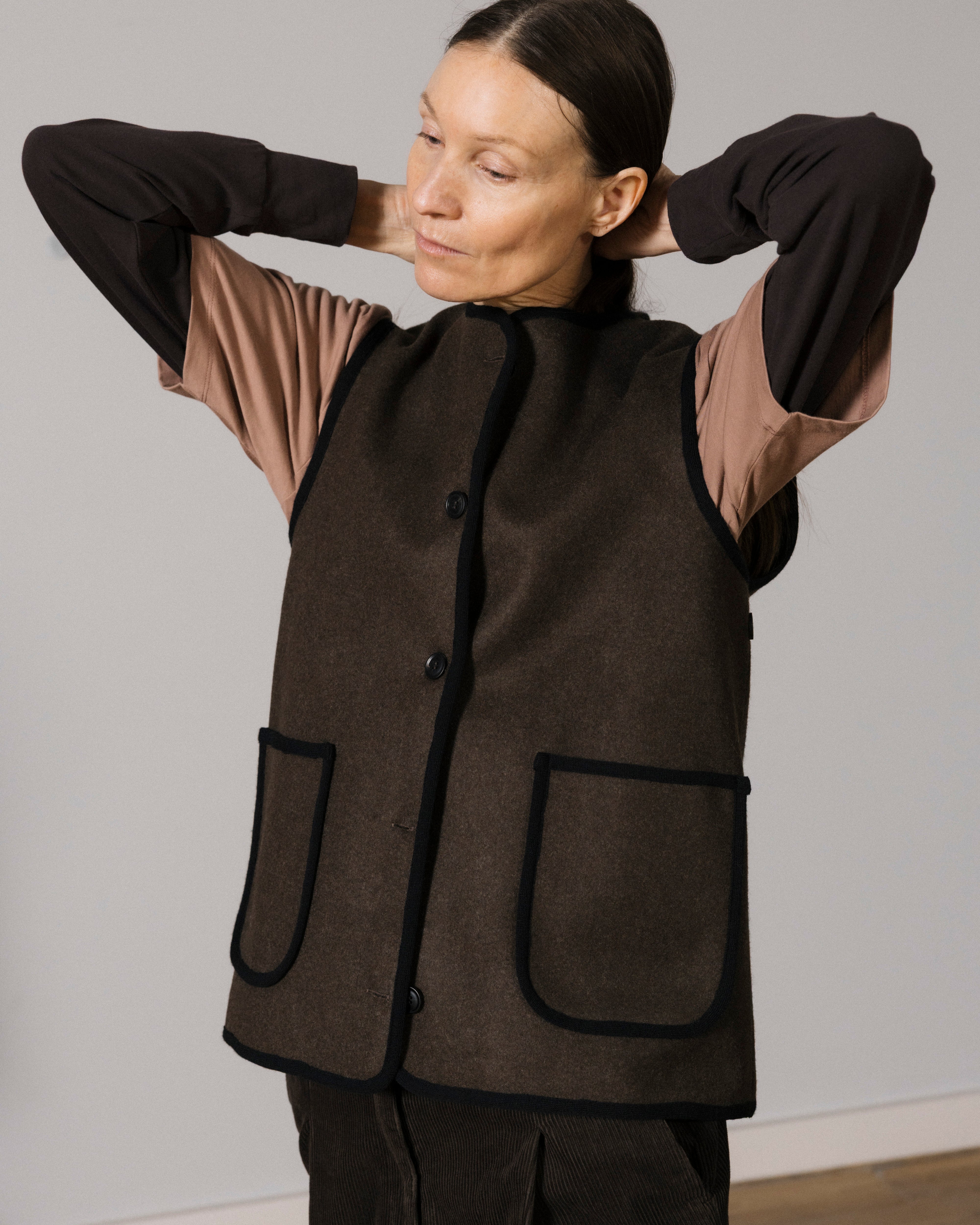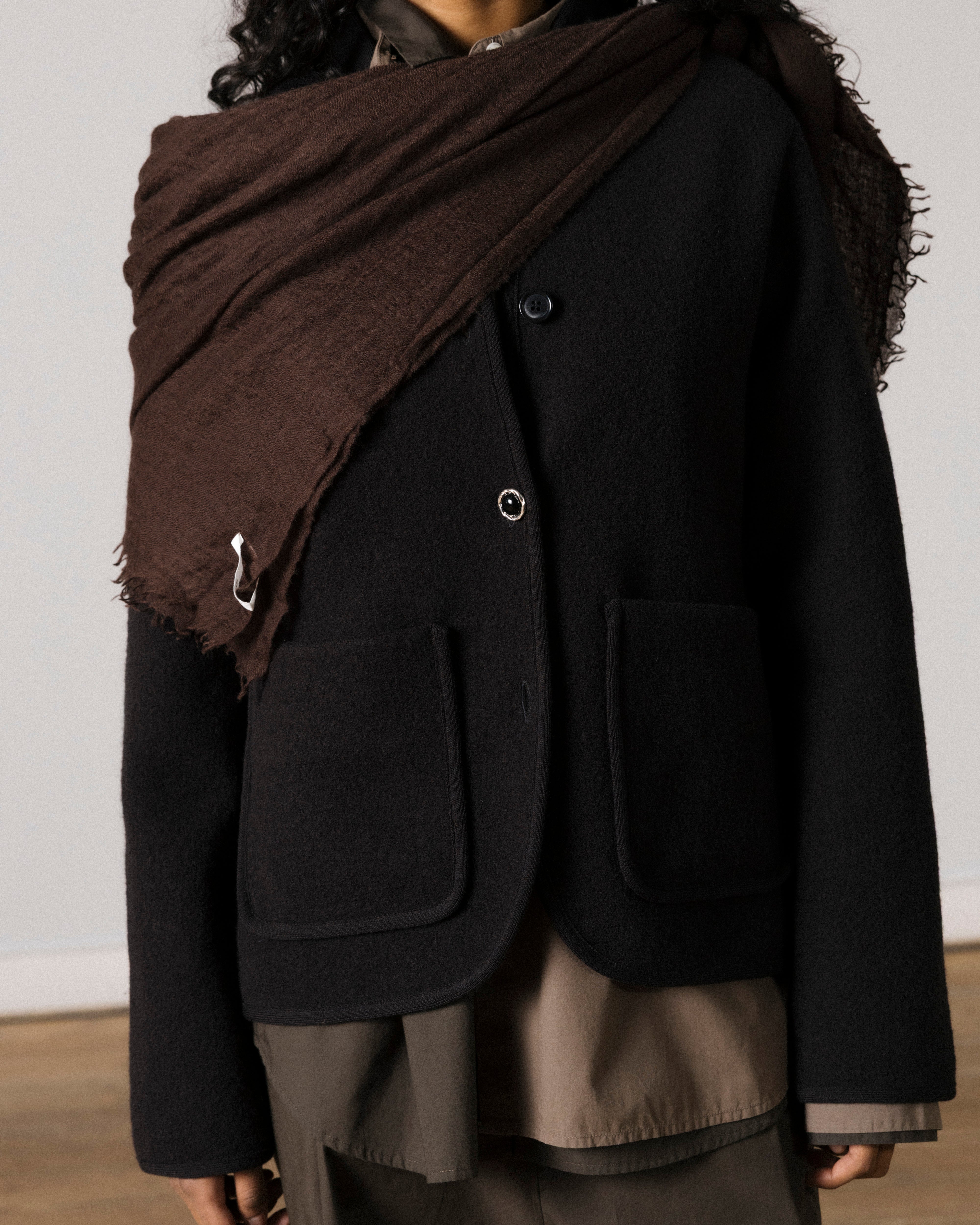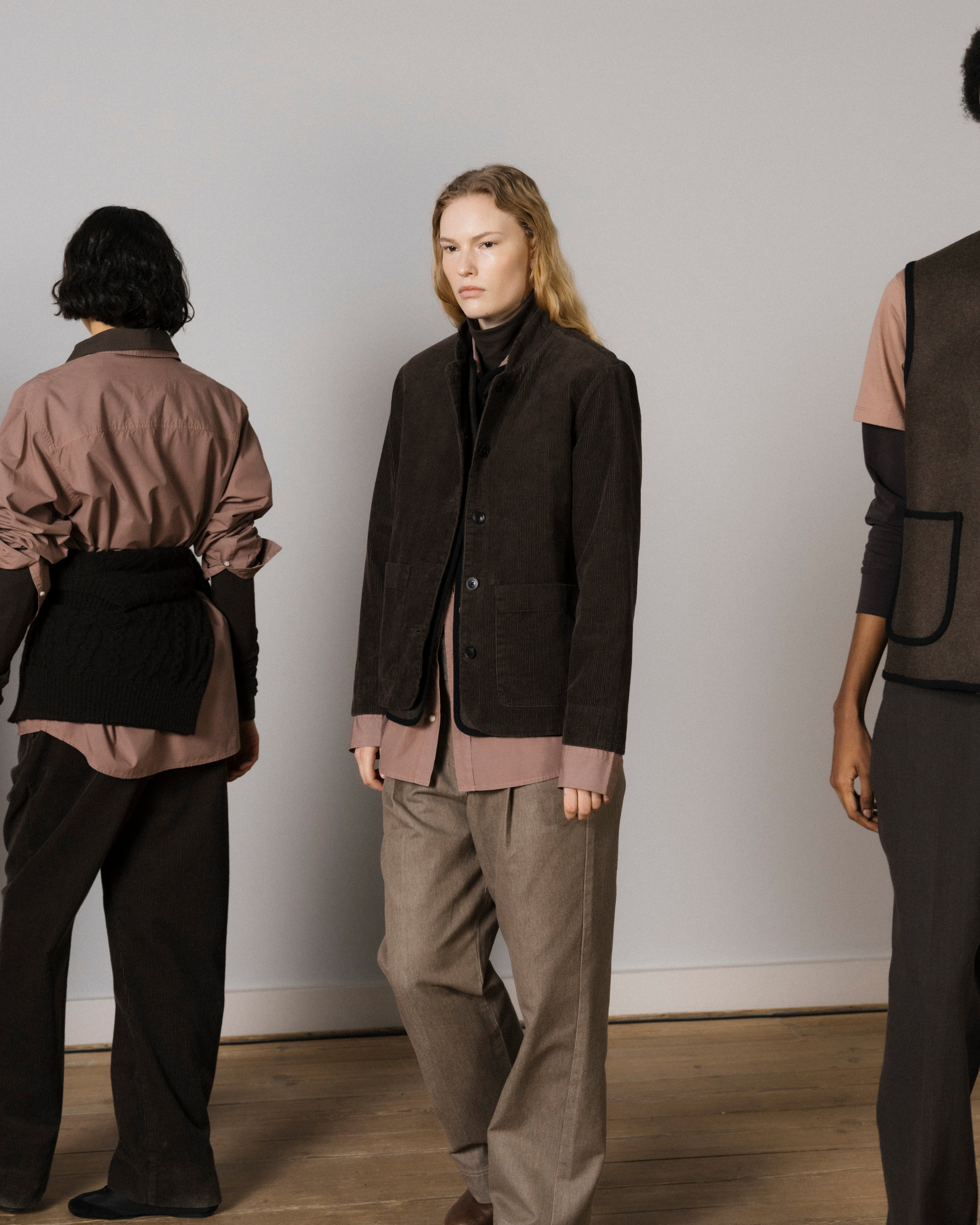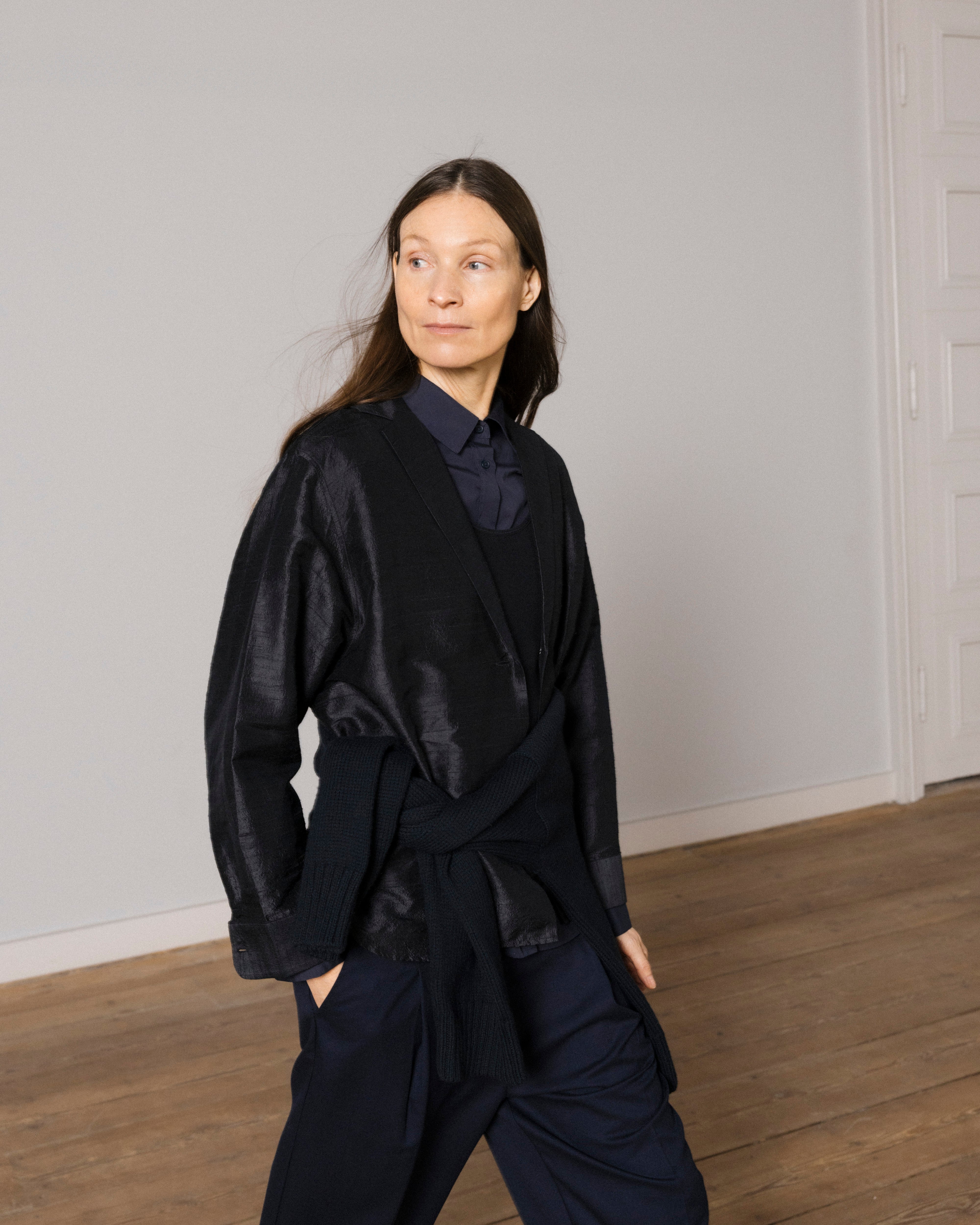 “What began as a shared curiosity around the button as an object evolved, through a mutual respect for materials and craftsmanship, into a small series of peculiar pieces. We approached the button as a piece of jewelry – a tribute to the button, elevated beyond its traditional role. Handwrought in recycled sterling silver, it becomes a kind of integrated brooch that forms part of the garment, yet it’s designed to travel over time from one piece to another.. The collaboration unfolds across the inherent lifespans of different materials, united by a shared devotion to artistry, longevity, and thoughtful making.”