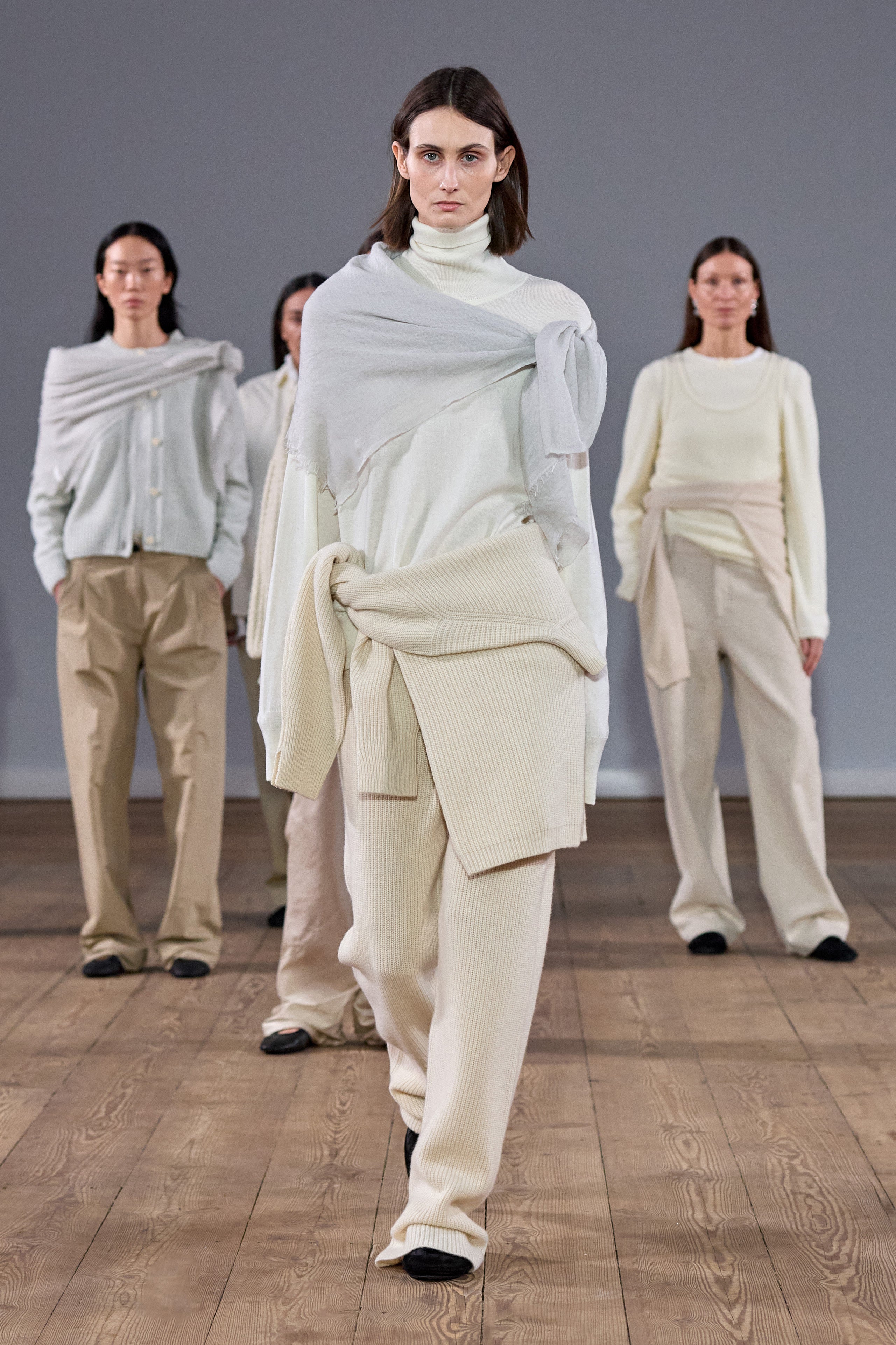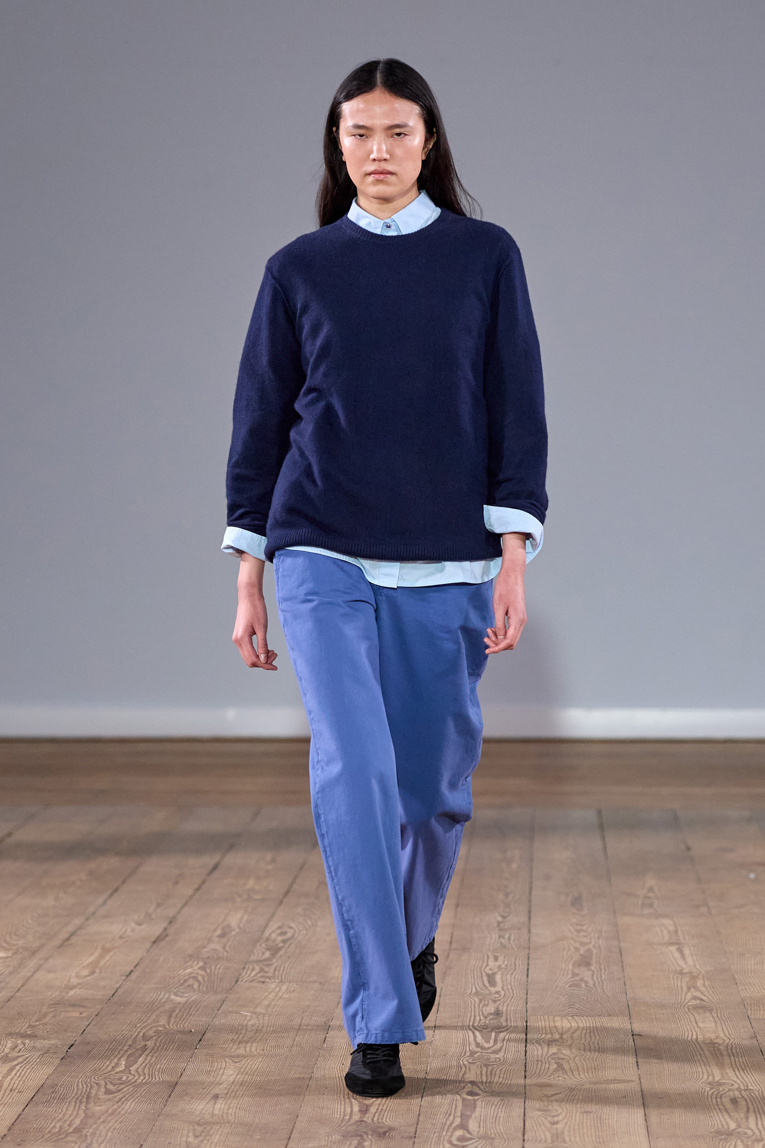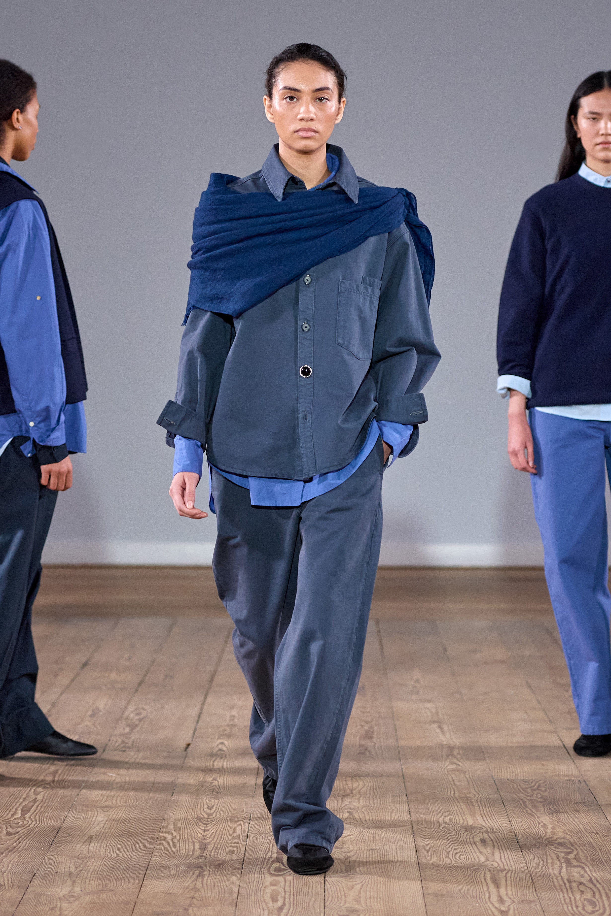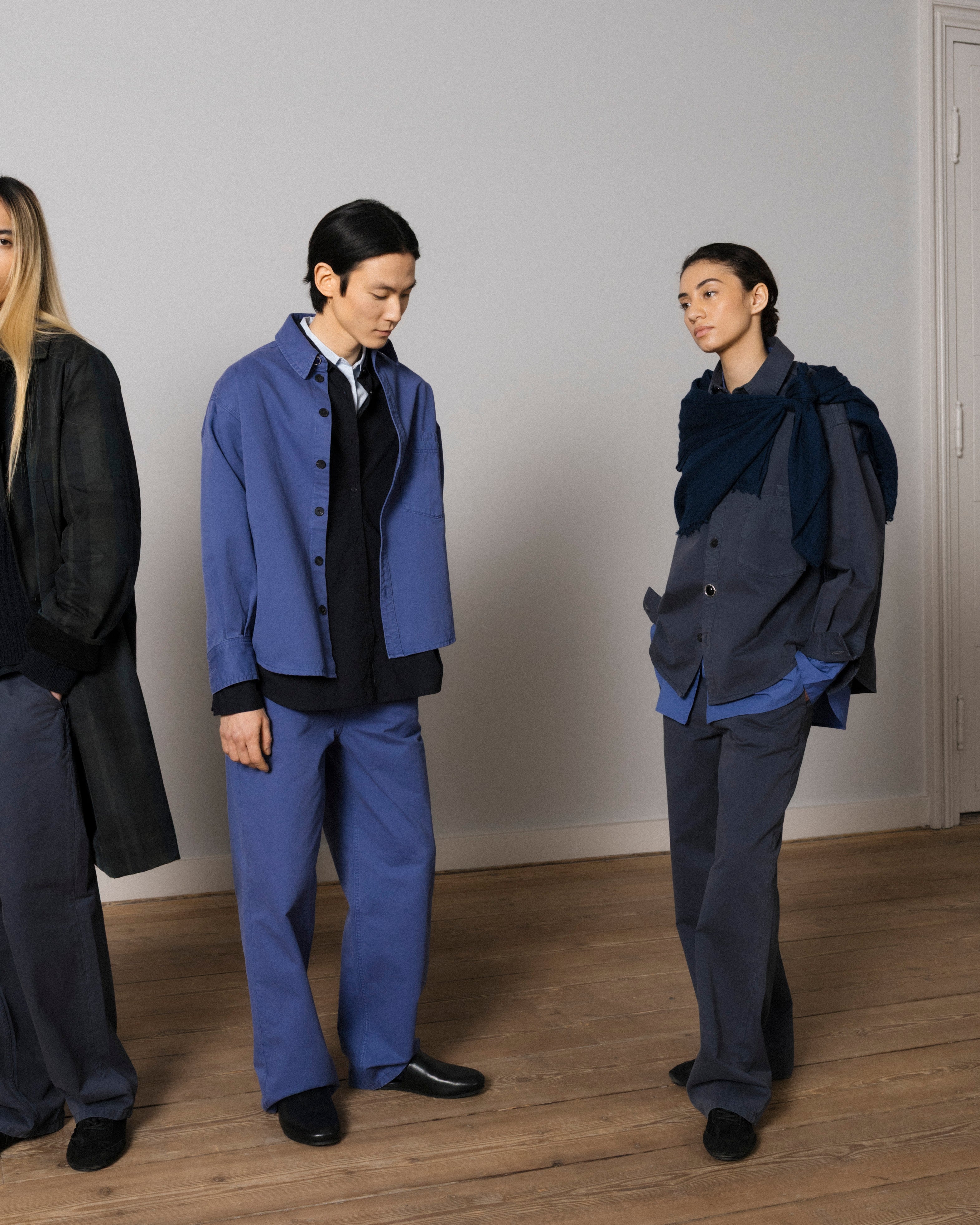 The palette was drawn from nature’s own hues framing recycled silks, fine wools, and softened knitwear. Undyed ecru, whites and dove mouliné with soft blue undertones brought a gentle clarity, while dusty rose added warmth. Blue tones defined the collection, from classic navy to washed French blue, set against natural hues of warm khaki, bark, and cognac. As the palette deepened into nuances of brown, dark roots and black, it settled into a grounded harmony.