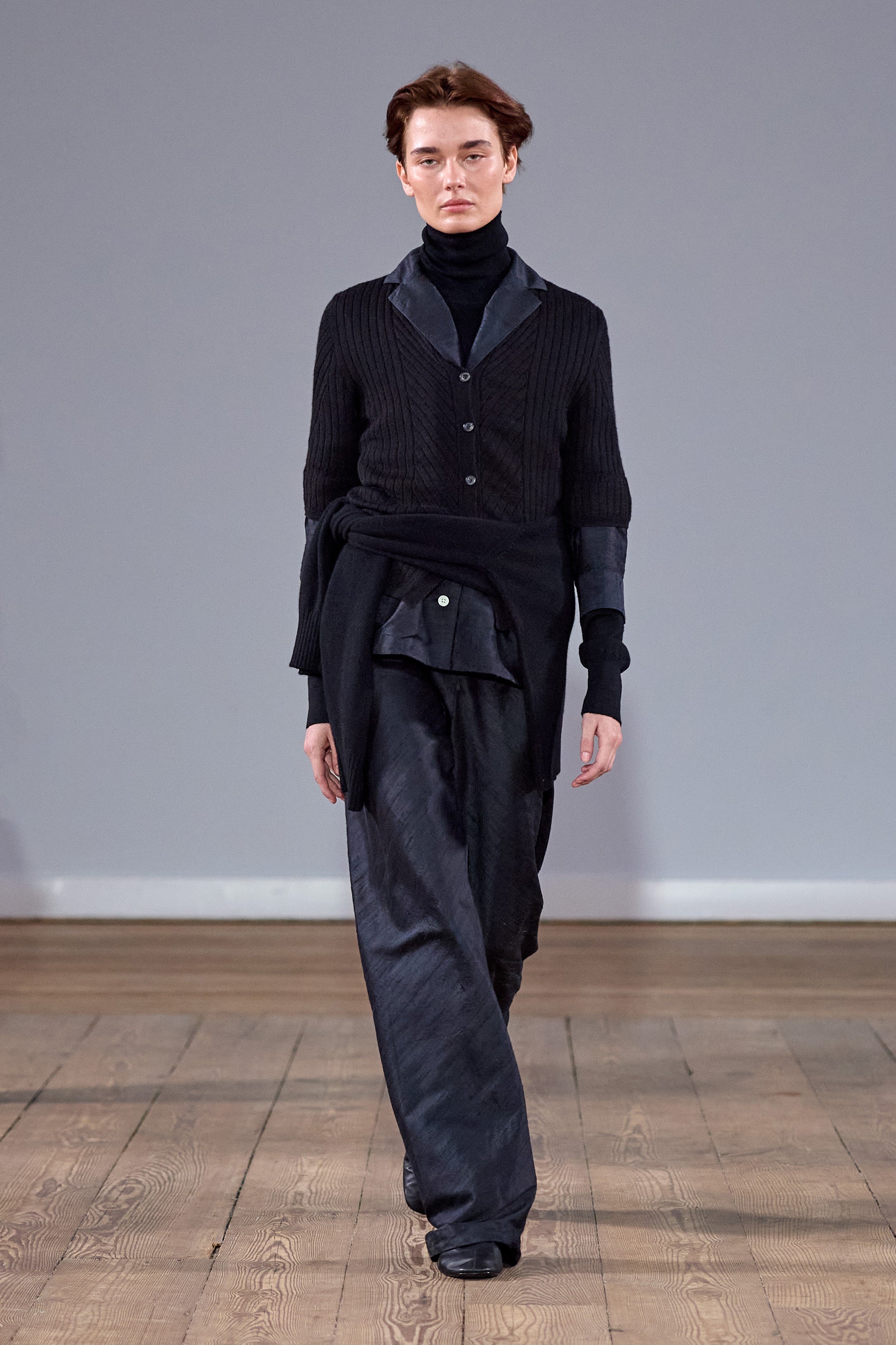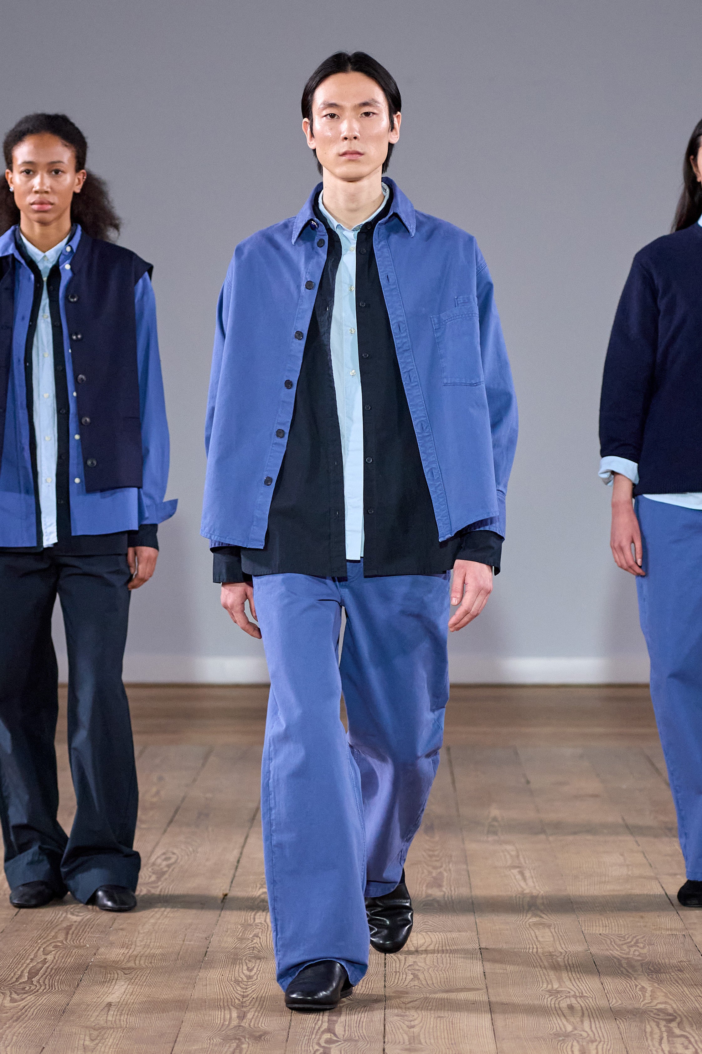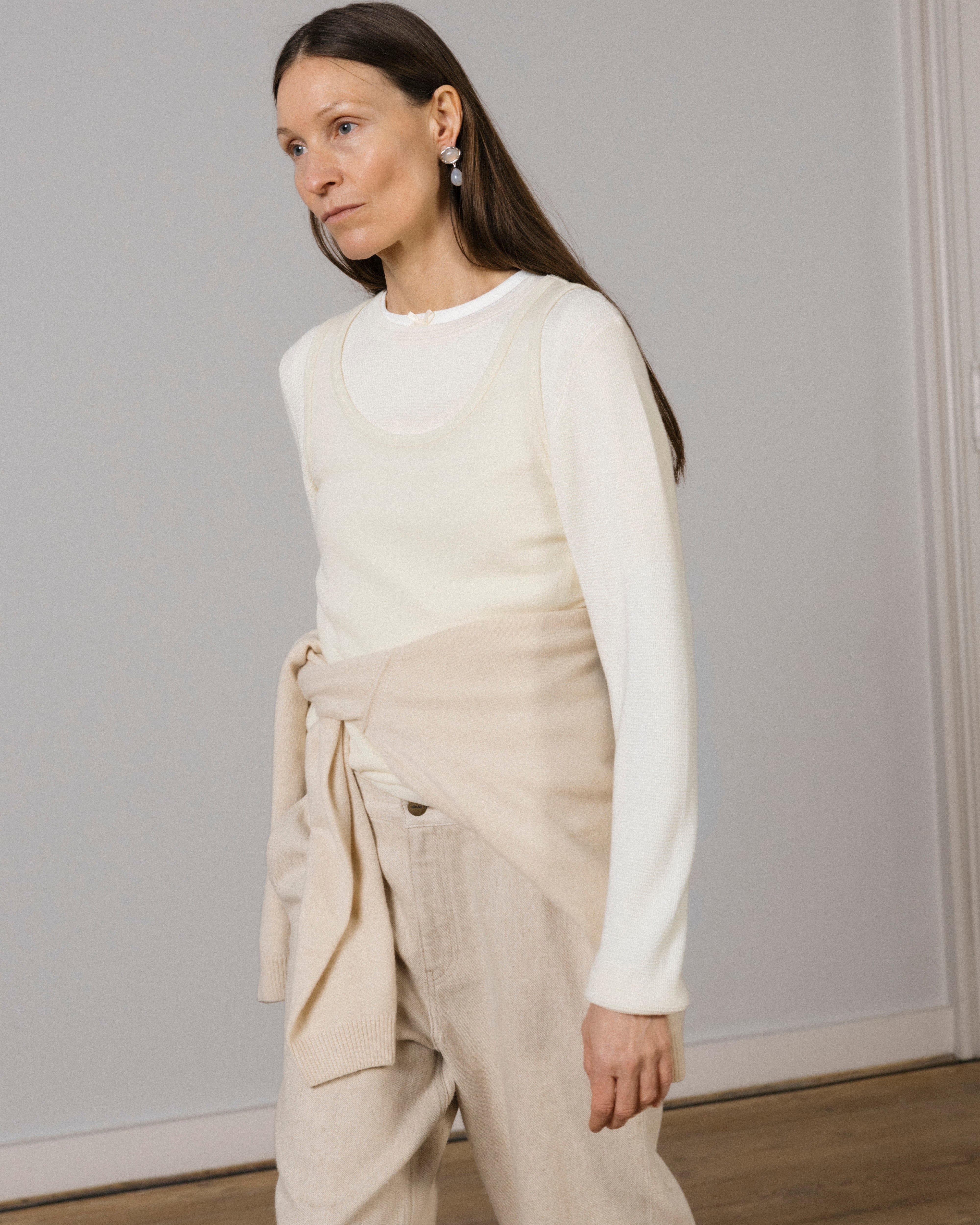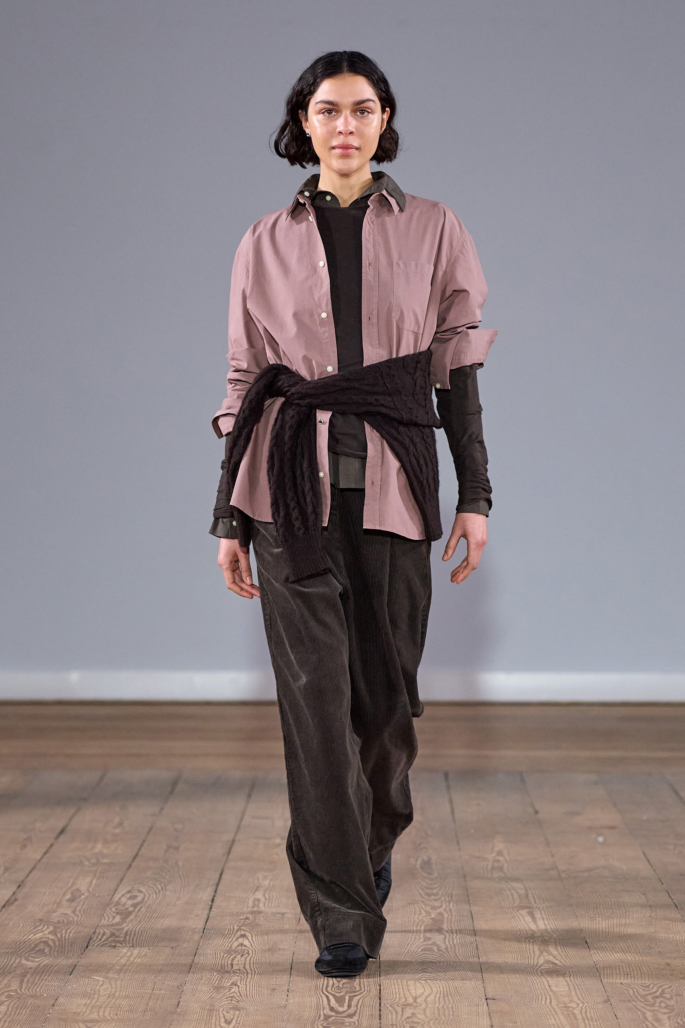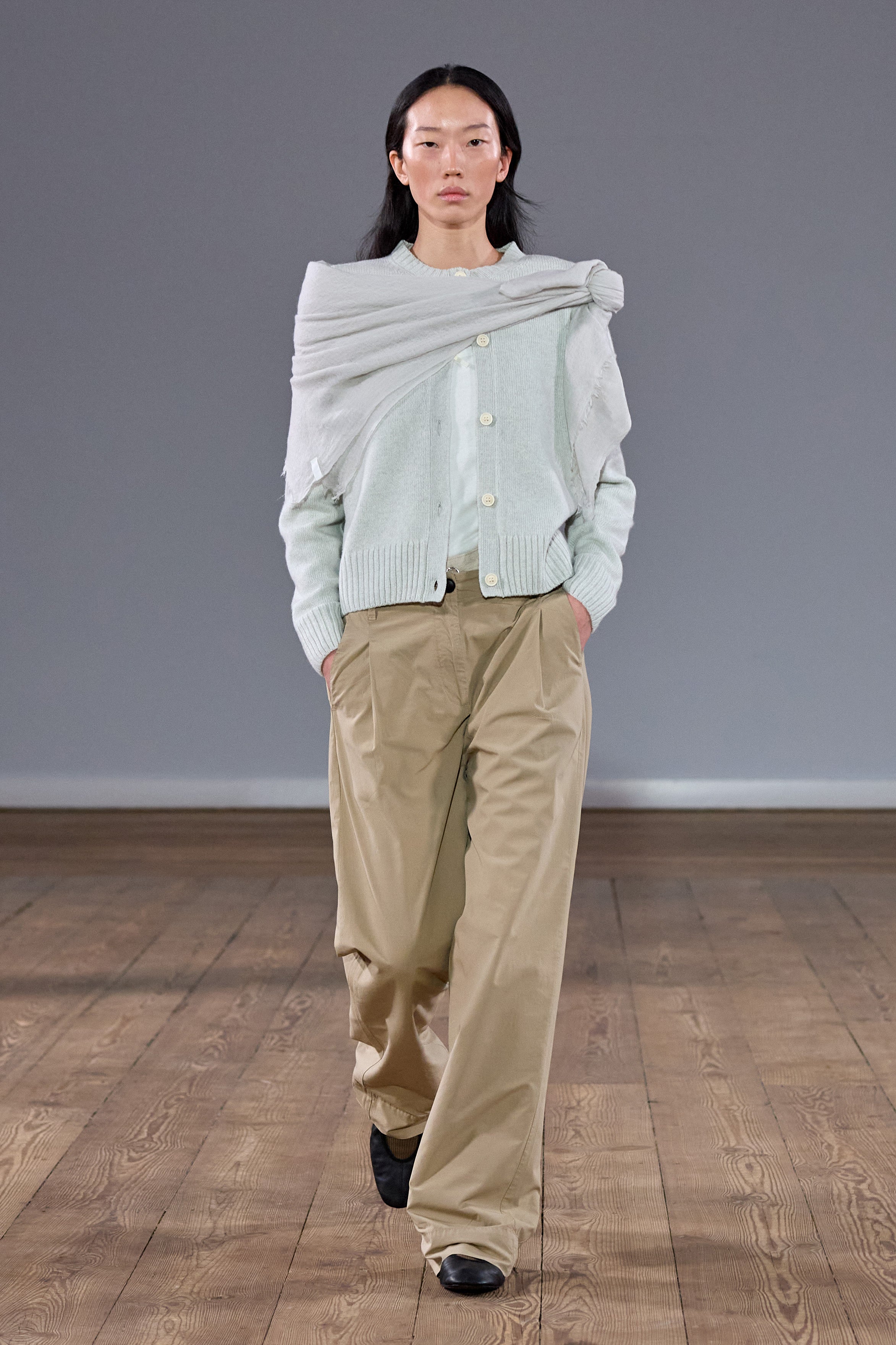 The palette was drawn from nature’s own hues framing recycled silks, fine wools, and softened knitwear. Undyed ecru, whites and dove mouliné with soft blue undertones brought a gentle clarity, while dusty rose added warmth. Blue tones defined the collection, from classic navy to washed French blue, set against natural hues of warm khaki, bark, and cognac. As the palette deepened into nuances of brown, dark roots and black, it settled into a grounded harmony.