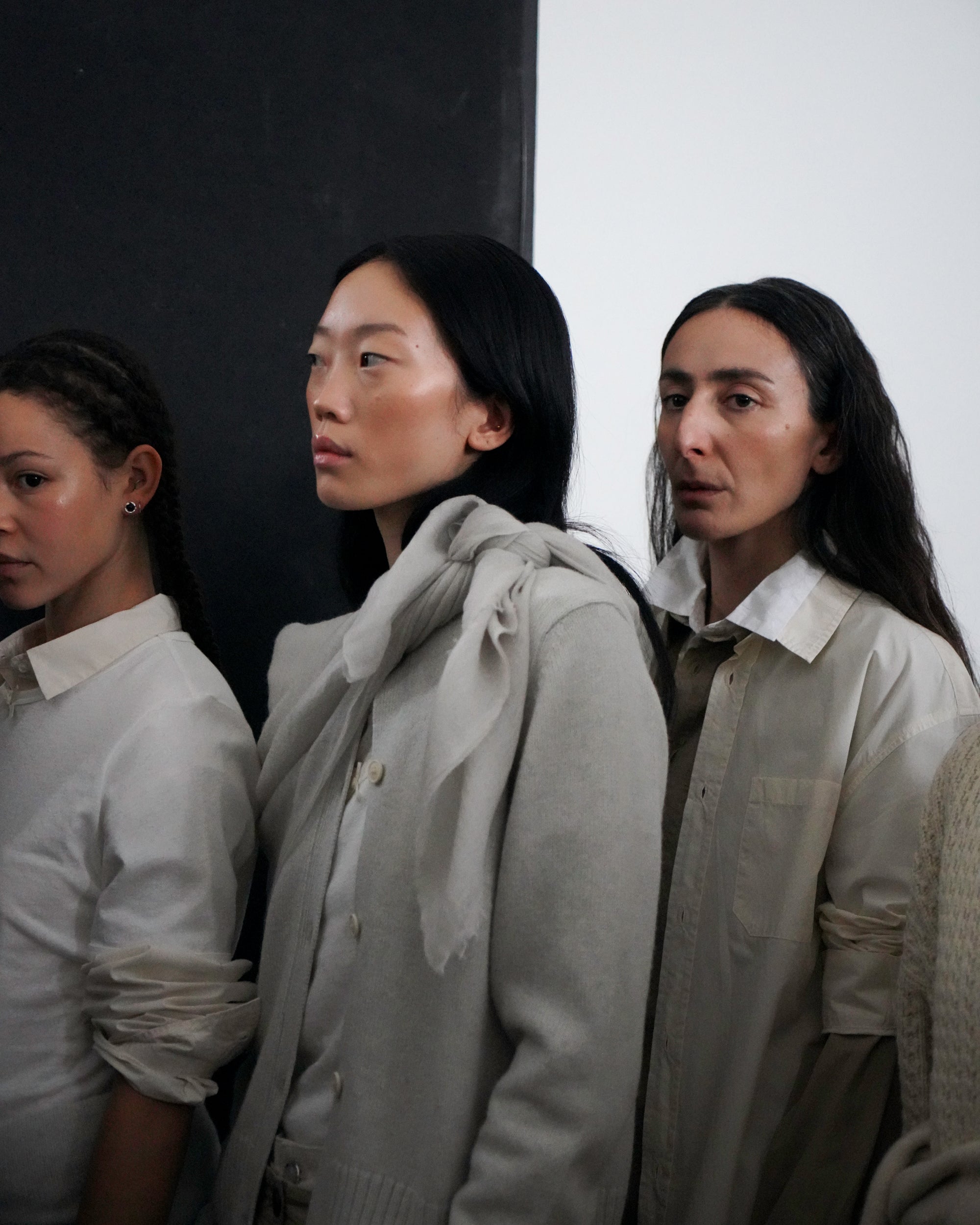 Our autumn – winter 2026 show explored the space between individuality and togetherness. The show unfolded as a choreography by Breckyn Dávila Drescher that floated through a harmonious set design: a living formation of models, each styled in natural gradient tones that softened into one another and became one palette. From soft whites into deeper, grounding nuances of navy, brown, and black. Individually, each model carried their own presence. Together, they formed a rhythm of repetition, variation, and change – between the one and the many.